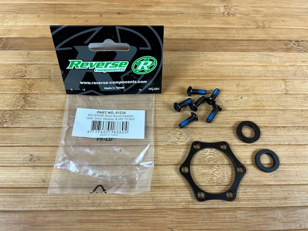 Im Set enthalten sind zwei Spacer mit jeweils 3 mm zur Verbreiterung der Achse, eine 3 mm Adapterplatte für die Bremsscheibe und 6 St. lange Bremsscheibenschrauben (M5x15)